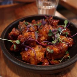 This restaurant was pretty busy on a Wednesday evening and it deserves to be. The food was both delicious and perfect for sharing (my favorite of the dishes ordered was the Korean popcorn chicken). Some of the cocktails come in fun pouches and they were very unique in flavor. Service was on point and the dimly lit ambiance made this place ideal to catch up with friends. I would highly recommend this restaurant and will be coming back soon!