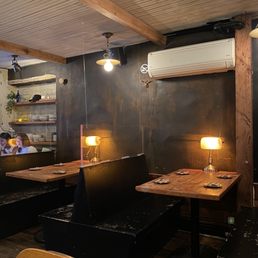 5/5 Food - wonderful mix of flavors Korean tapas 5/5 Atmosphere - dimly lit 5/5 Service - attentive and quick We got seated immediately at the bar for 2 people on a busy Saturday night (definitely got lucky as this place was packed). We shared 5 dishes + desert between the two of us which was maybe a tad too much food even though we were really hungry. The highlight for me was 100% the edamame dumplings with this delicious truffle sauce and Parmesan sprinkled on top. This was the chefs kiss! The beef steak was quite good too. The noodles had a kick and could be skipped. The tacos were good too. The empanadas were find also could be skipped but the sauce really made this dish. The berry bread pudding was really good too. The staff was helpful and friendly. They have outside seating too. The wait can be long depending when you go. The atmosphere is perfect for a first date or a night with friends or family.